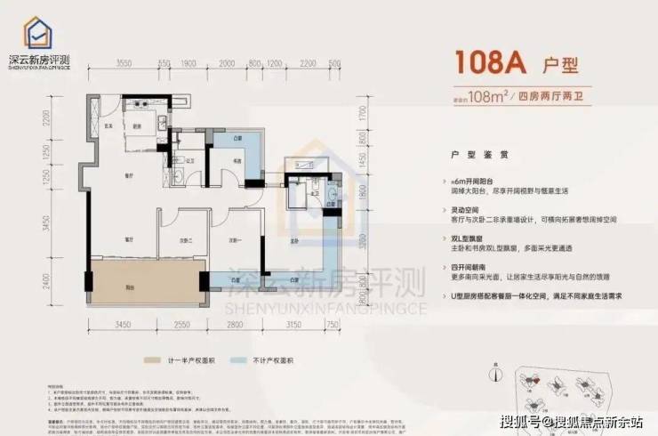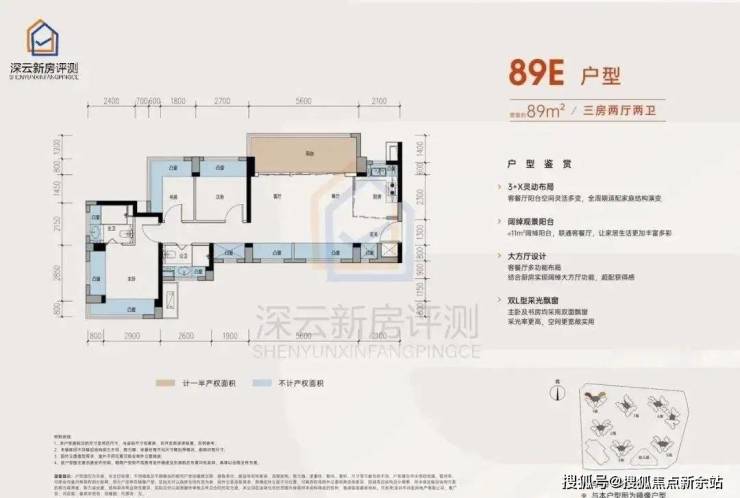 ✅89㎡横厅:均价288万(低楼层280万出头,得房率约105%,灵动3+1房)