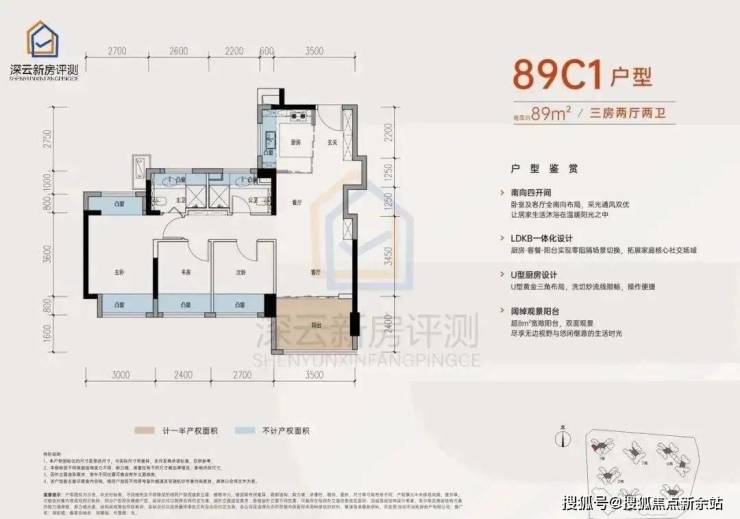 ✅89㎡竖厅:西南均价320万, 东南均价335万