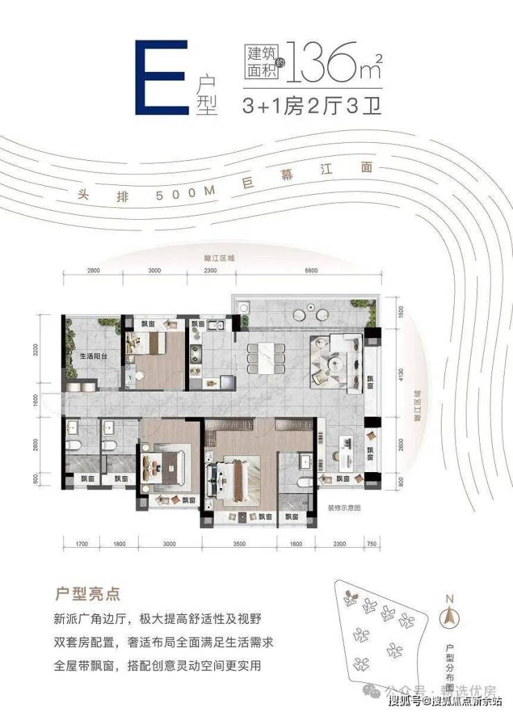 一、项目价值点1、【以江为贵】稀缺江景盘价值看得见,临江盘中性价比最高江历来是豪宅基因,一线望江盘代表了该板块房价天花板,由于江景资源的不可复制性、传统文化的风水福地、优越的居住体验,同一板块江景房价格普遍高于普通住宅,且升值潜力往往高于非江景房,真正的增值硬资产!