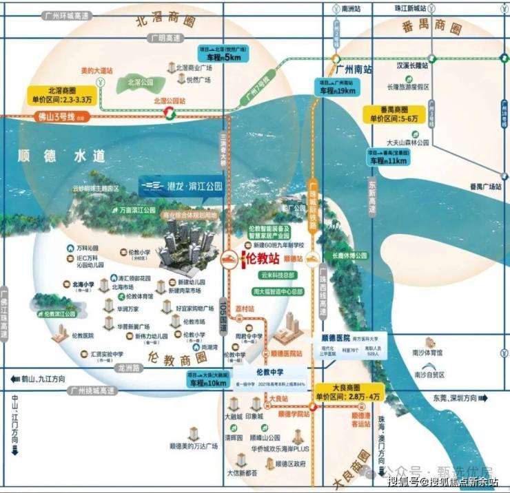 3、【地铁资产】家门口地铁:3号线伦教站已开通,广佛通勤不拥堵关键点:地铁1站北滘,3站大良,9站广州南,半小时畅行广佛公路:门口即是G105国道,北至北滘、广州新光快速,约10分钟可享受美的悦然广场配套,约40分钟直达广州海珠区;南连顺德大良,约15分钟即可享受凤城老字号美食。高速:项目距离佛山一环高速北滘入口约2km,迅达佛山五区,畅行大湾区。轨道: 距离广珠轻轨顺德站约7km,一站至广州南,1小时直达珠海。