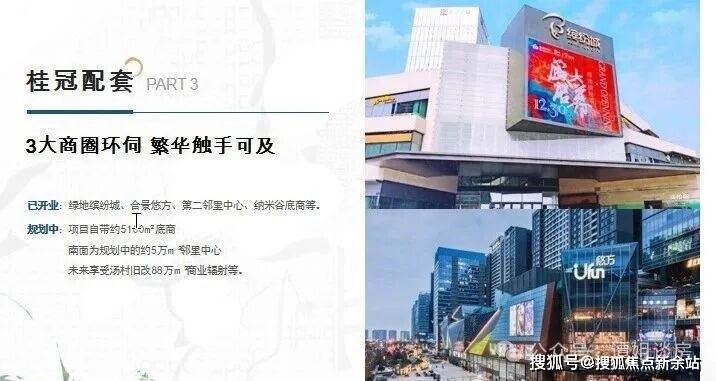 项目规划有约5100㎡底商在建。周边三大商圈环伺,近享绿地缤纷城、合景悠方等商业配套及规划的18个邻里中心;西侧纳米谷底商已开业南面为规划中的5万㎡邻里中心。