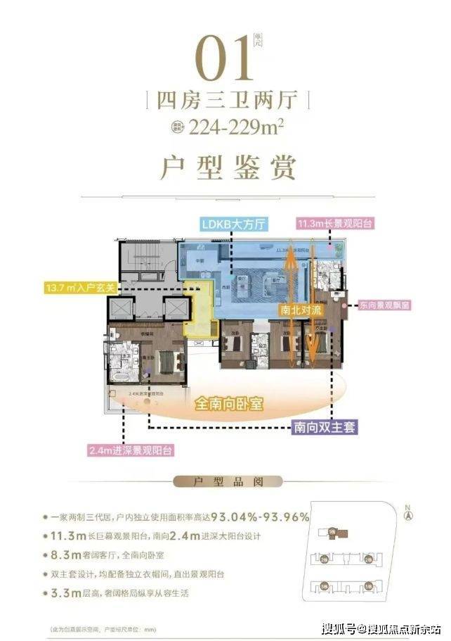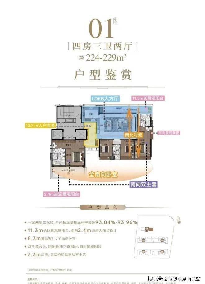 少量精品 多样选择:项目整体规模不大,全盘仅有 1 栋 16 层小高层和 28 栋叠院,共 68 席,其中高层 30 席,叠院 38 席。产品户型为 130㎡三房和 224 - 229㎡四房,满足不同家庭结构的需求。