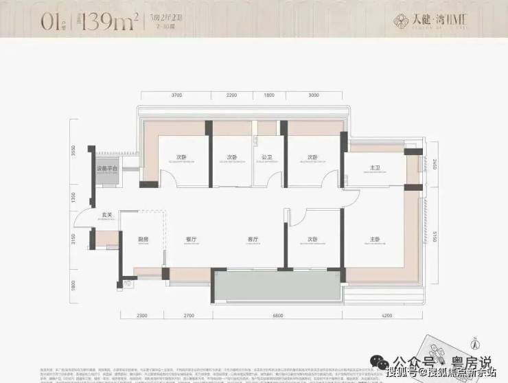 户型为113-114-115㎡四房和139㎡五房,标准层布局与保利瑧誉非常类似,但是没做独立电梯厅,2梯5户使用率高,凸窗做满再加上设备平台,所以赠送后得房率去到100%。