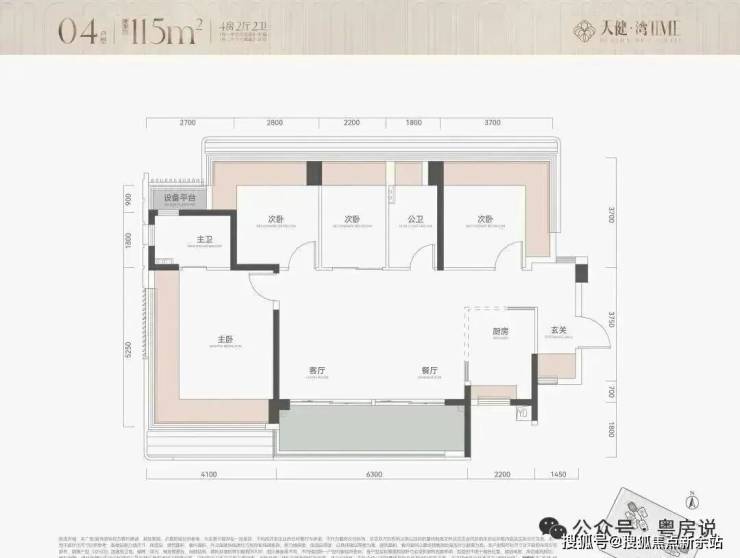115㎡4房2卫,横厅户型,朝南看海,入户独立玄关,但三个次卧朝北;