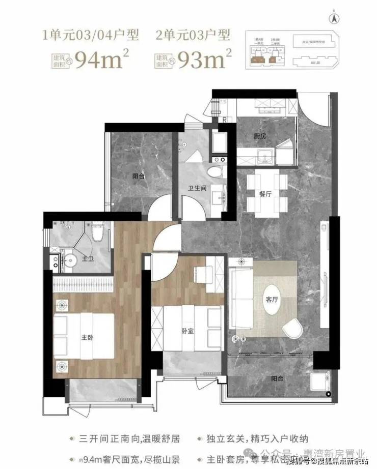 93-94㎡的3房2厅2卫,1栋1单元03、04户型/1栋2单元03户型,设计的是经典竖厅格局,客厅3.6米开间,LDKB一体化设计,动静分区,三开间朝南,9.4米面宽,二字型厨房,卫生间干湿分离,阳台正南朝向。