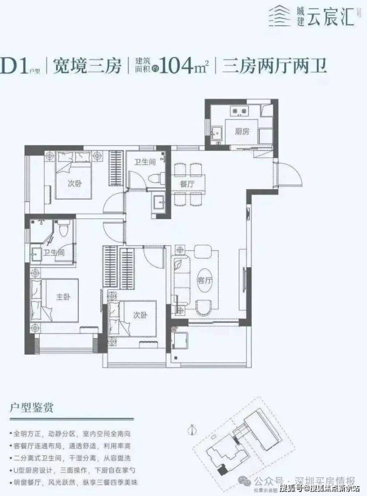 104㎡的3房2厅2卫,设计的竖厅南北通透格局,餐客厅一体化,U型厨房,阳台西南朝向。