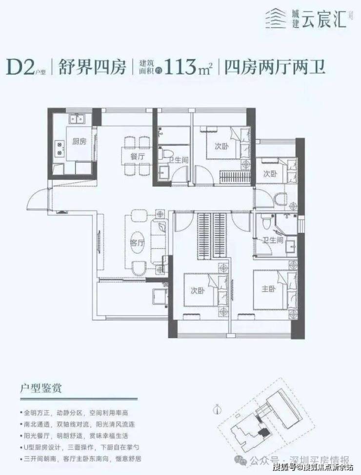 113㎡的4房2厅2卫,设计的竖厅南北通透格局,餐客厅一体化,U型厨房,阳台东南朝向