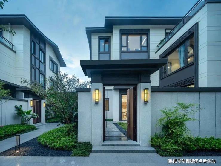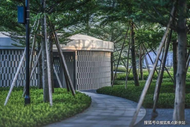 合院采用岭南设计风格,270°风光围合,用石材铺装,以草坪加灌木、乔木的方式创造出了多重立体植物的庭院空间,以石柱、月洞门等景观小品加以点缀。