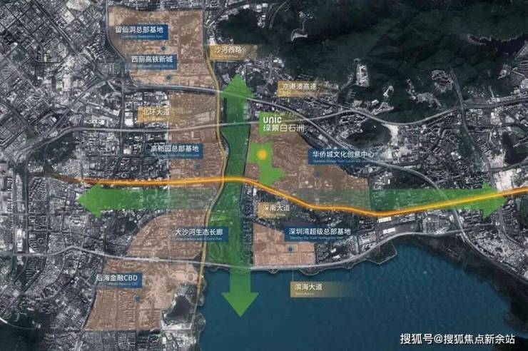 绿景白石洲位于深圳核心位置南山区的华侨城片区,深圳城市发展主轴——深南大道与大沙河创新走廊十字交汇点,依托华侨城人文艺术城区,链接后海总部基地、深圳湾超级总部基地、留仙洞总部基地、高新园总部基地四大总部基地。
