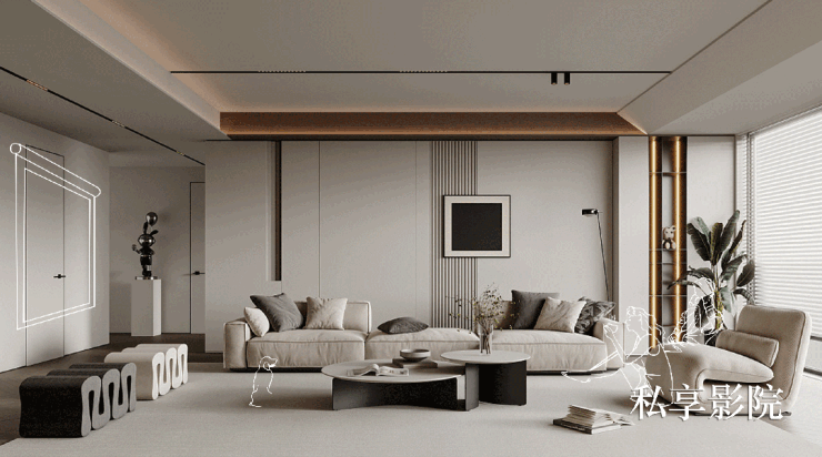 同时纵贯客餐厅的天花吊顶,采用了柔滑的弧形线条,其中还嵌入了日本大金中央空调(或同等品牌),以及美国百朗新风系统,在南北对流的基础上,进一步提升空气质量。