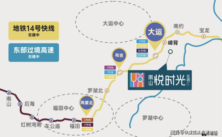 南山悦时光,高效通达东部主枢纽“湾区之舞”大运枢纽站,立享地铁+高速+城际等多线枢纽交通,迅速触达深圳全域生活圈;坐拥东部首条快线一14号快线,毗邻章背站,实现1站大运,8站福田。