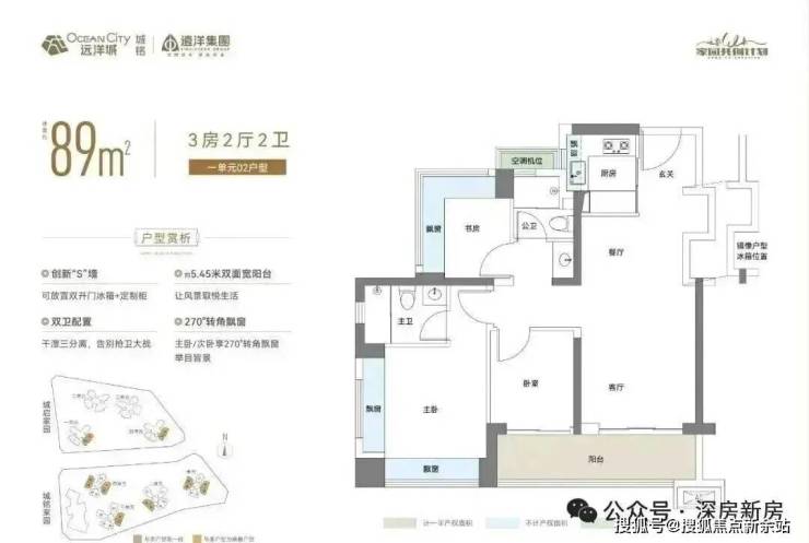89㎡的3房2厅2卫,02.03户型,设计的是经典竖厅格局,客厅3.4米开间,LDKB一体化,S墙设计预留冰箱卡槽位,动静分区,三开间朝南,3个卧室分别做到了主卧13.79㎡/次卧7.62㎡/次卧6.93㎡(包含墙体飘窗),主卧+1个次卧270°飘窗设计,U型厨房,公卫三段式分离,客厅连接卧室出5.75米长的大阳台,得房率约87.2%(包含赠送),东南朝向。