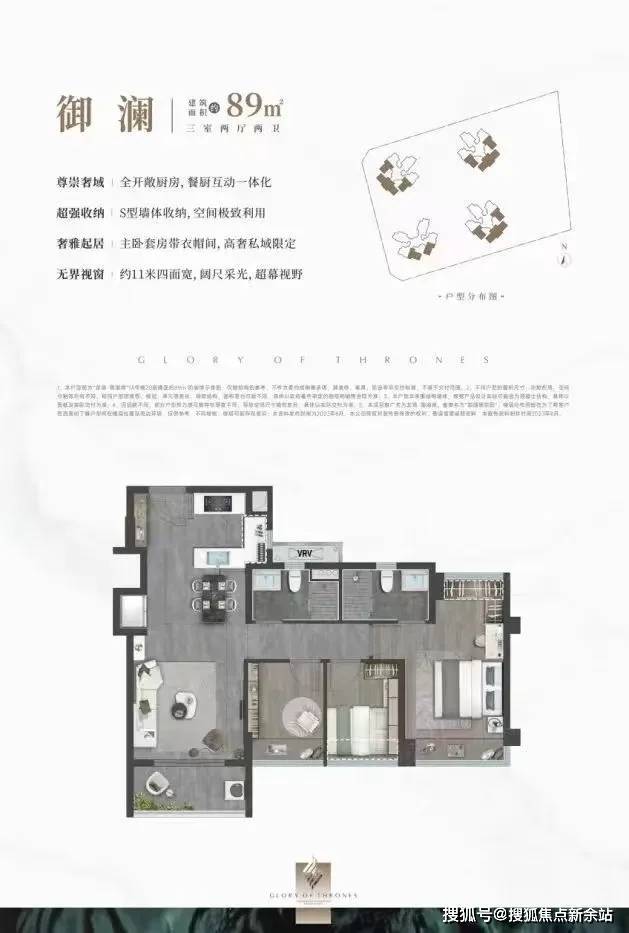89㎡的3房2厅2卫,设计的是新版竖厅格局,客厅开间3.5米,LDKB一体化,S墙设计预留冰箱位,约11米四面宽超幕视野,主卧套房带衣帽间,U型全开敞厨房,得房率:78.99%(不含赠送),有西北、西南、东北、东南4个朝向。