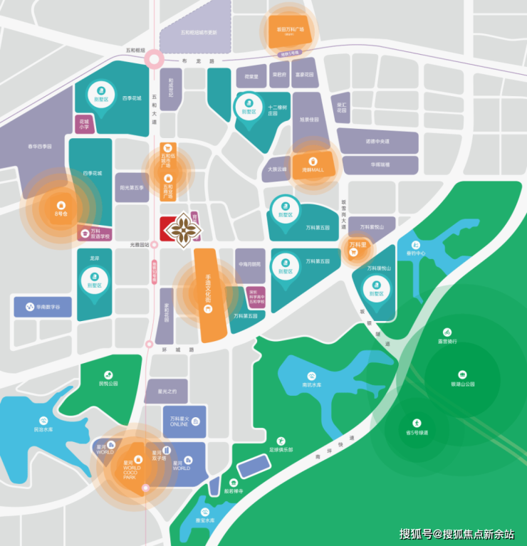 北侧160米:五和商业广场、宝银商业广场,以餐饮、便民服务为主,适合日常聚餐与生活服务。西侧650米:8号仓奥特莱斯,华南区家“OUTLETS+LOFT”综合体,汇聚200+国际国内一二线品牌折扣店,搭配特色餐饮、BABYCITY儿童教育、豪华影院等,满足家庭购物、休闲娱乐需求。