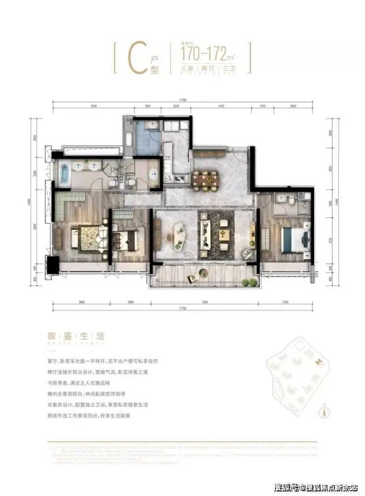 比如,建面约170—172㎡的3+1房,空间尺度非常阔绰!四开间朝阳,卧室分布在两端,中间带一个开间达7.3米的观景阳台,视野广阔;即便是三代同堂,也能做到互不干扰,生活舒适。