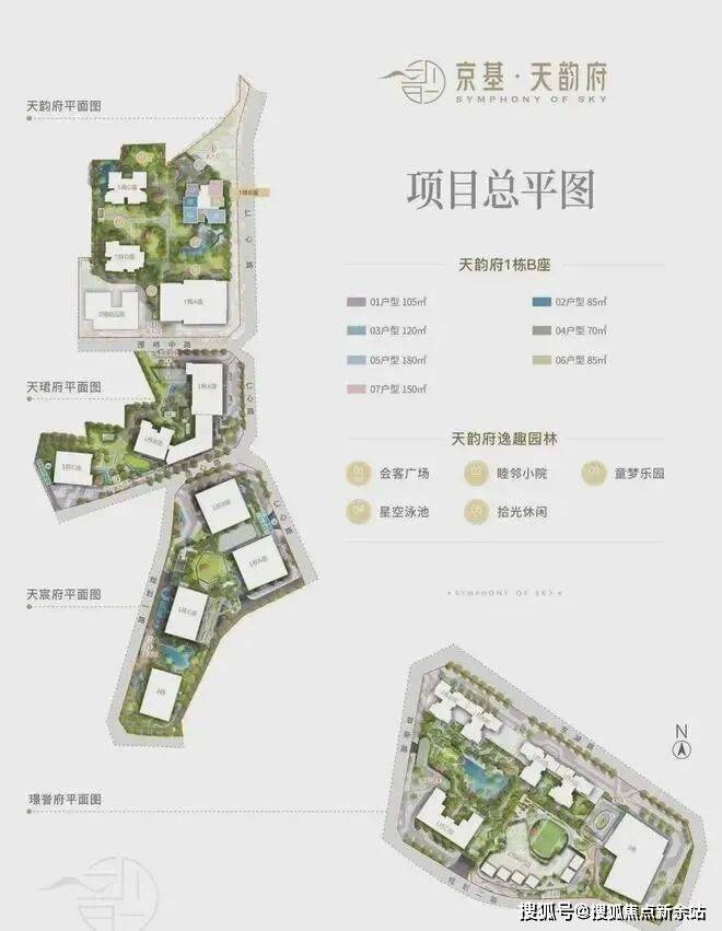 主要由2栋62层的回迁房单元、1栋62层5梯7户的商品房、1栋52层的商务公寓单元,以及一所幼儿园所组成。其中京基天韵府对外发售的商品房,就集中在1栋B单元,包含了7种户型,共计244户房子,停车位995个。