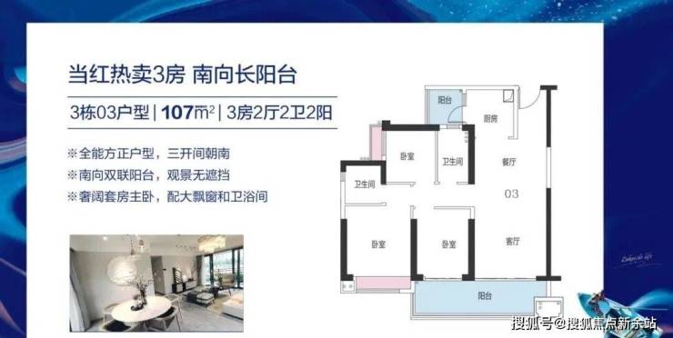建筑面积约95㎡的舒适三房,双阳台设计,一边用于晾晒,一边用于观景,实用性满分。