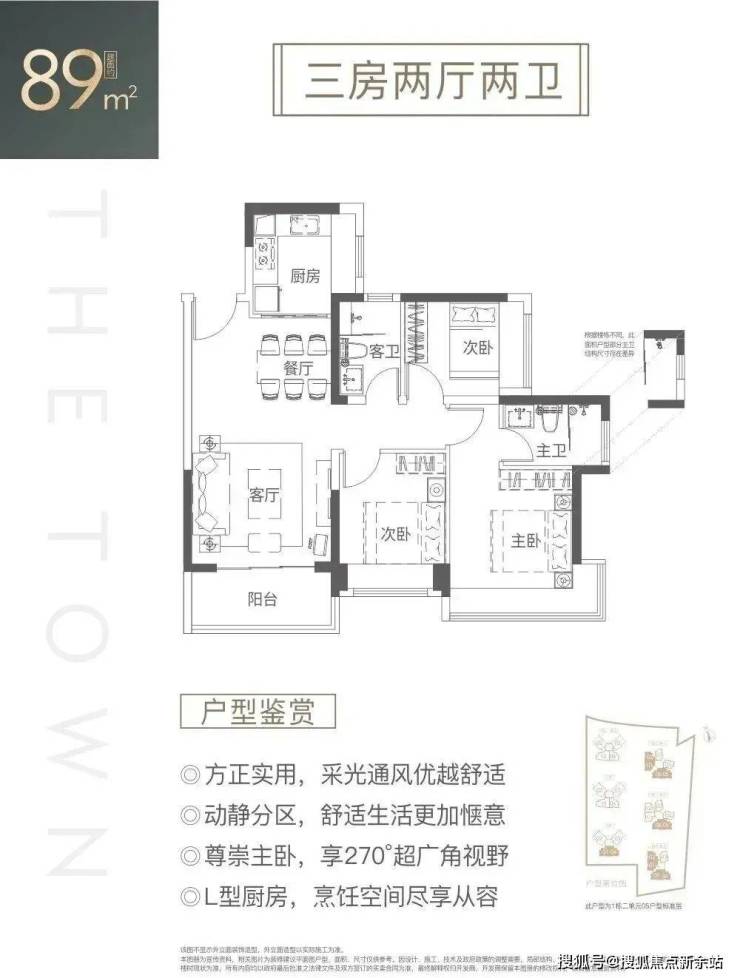 89㎡的3房2厅2卫,设计的是经典竖厅格局,客厅3.6米开间,LDKB一体化设计,动静分区,3个卧室分别做到了3.2米/2.7米/2.5米的宽度,主卧270°超广角视野,L型厨房,卫生间干湿分离,得房率:76.33%(不含赠送),有西北或西南朝向。