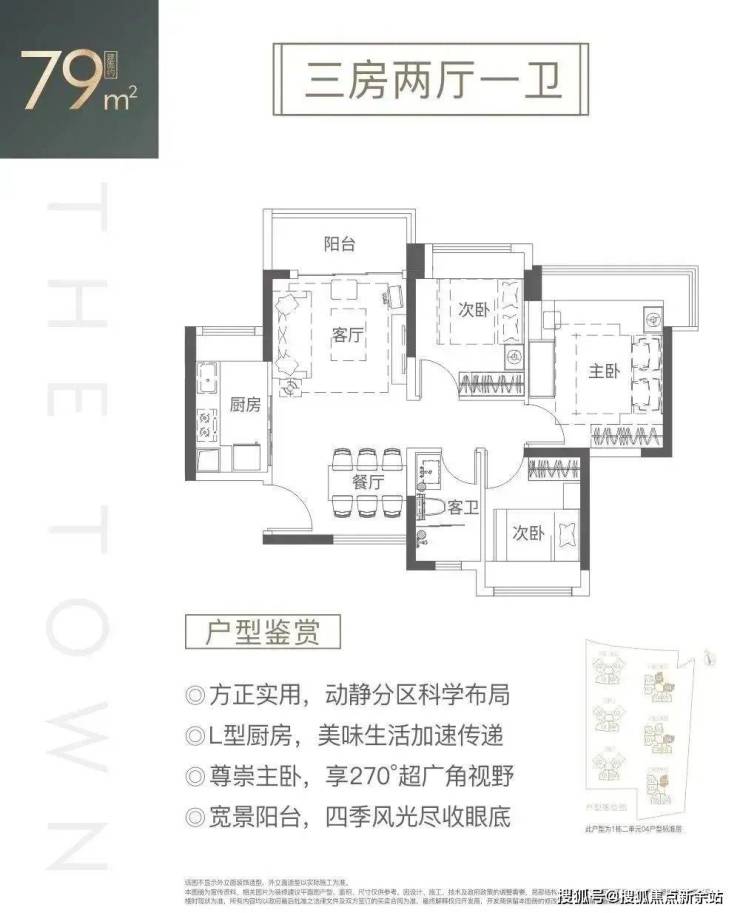 79㎡的3房2厅1卫,设计的是竖厅南北通透格局,客厅3.6米开间,LDKB一体化设计,动静分区,四开间朝南,主卧270°超广角视野,L型厨房,卫生间干湿分离,得房率:76.33%(不含赠送),东南朝向。