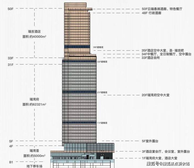 项目总占地约7700㎡,建筑面积约10.7万㎡,其中包含了约4万㎡瑞吉酒店、6.2万㎡企业会馆瑞湾府以及5000㎡瑞湾荟商业,是一个集企业会馆、五星级奢华酒店、精致商业于一体的垂直综合体。