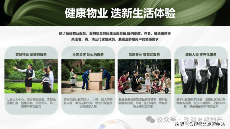 除了基础物业服务,更构筑全龄段生活服务链,提供家政、养老、健康服务等,关注老、青、幼三代家庭成员,兼顾全龄段用户的情感需求。
