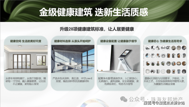 健康空间设计、健康材料选择、健康设备配置、匠心品质等四大板块的标准全面升级,遵循4大流程与12项要求,匠心打造内外空间,严选水包水涂料、真石漆、中空Low-E双玻等材料。升级直饮水入户等,让人居更健康。