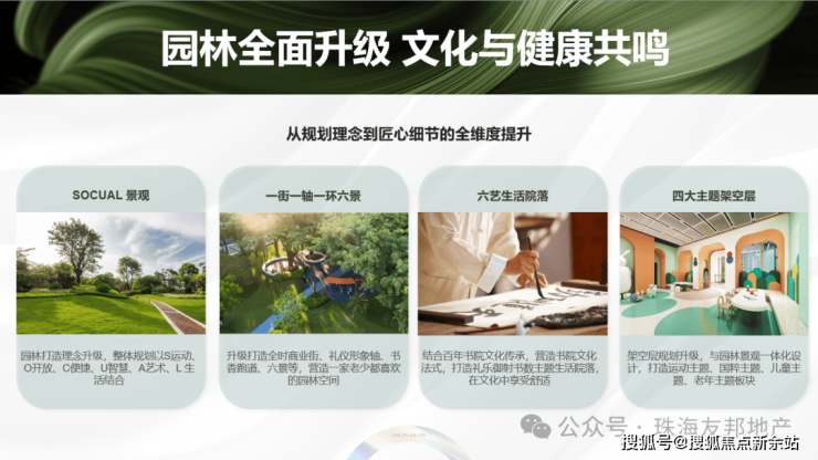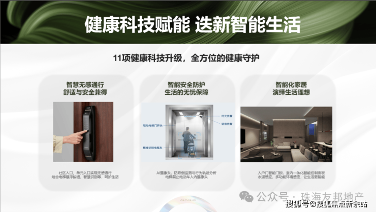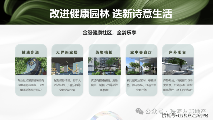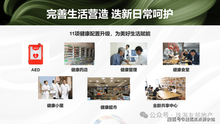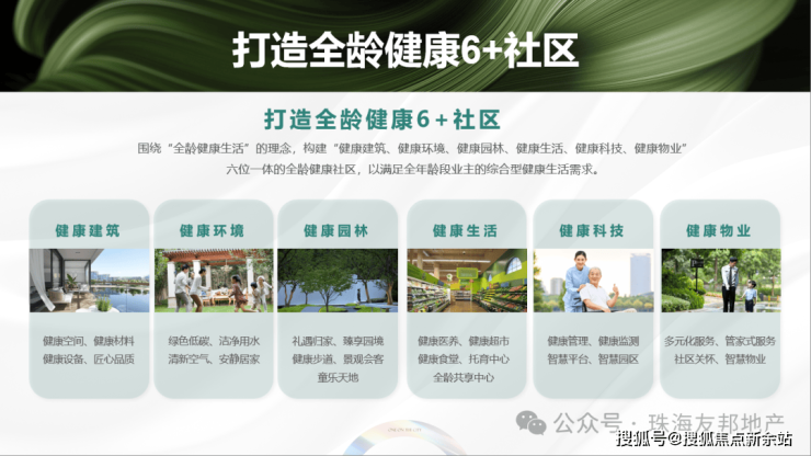 围绕“全龄健康生活”的理念,构建“健康建筑、健康环境、健康园林、健康生活、健康科技、健康物业”六位一体的全龄健康社区,以满足全年龄段业主的综合型健康生活需求。