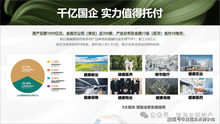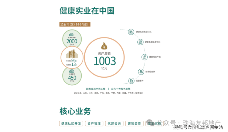 旗下健康实业进驻上海、山东、广东、海南、新疆等12省(市),开发项目95个,荣获中国品牌房地产100强,省属国有企业中最大康养地产开发企业等荣誉资质。打造国家康居示范工程,国匠实力,值得托付。