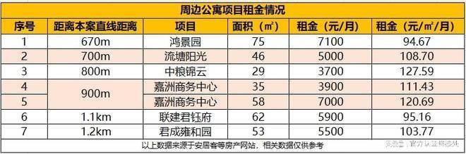 目前距离本项目约700m的45㎡产品的月租金可达5000元,同时周边73㎡产品的月租金可达7000元