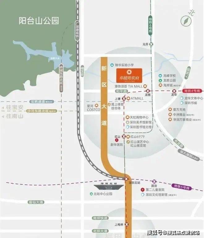 除项目自身外,周边配套也是非常的完善。卓越珺奕府项目南侧为港铁天颂和深铁珑境,北侧及东侧均被城中村包围,居住环境一般,西侧望向阳台山森林公园,未来项目高层或可欣赏自然山景。