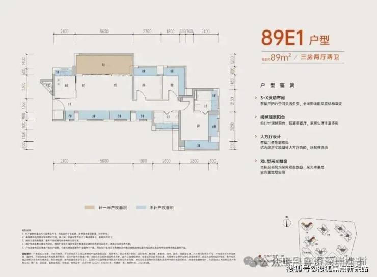89㎡的3房2厅2卫,E1户型,设计的是横厅南北通透格局,进门入户玄关,客餐厅5.6米开间,LDKB一体化设计,客餐厅出11㎡的大阳台,主卧+1个次卧双飘窗设计,全屋12面飘窗,分别做到了主卧15.1㎡/次卧7.83㎡/次卧6.96㎡(包含墙体飘窗),L型灵动式厨房,卫生间干湿分离,得房率约:77.39%(不含赠送),阳台主朝西北向。也是可以改4房的格局,赠送面积24㎡,加上赠送得房率104.44%。
