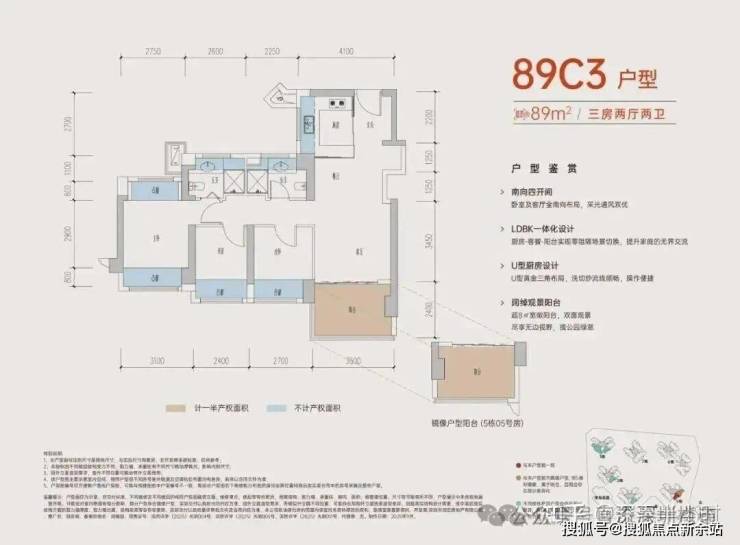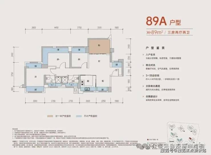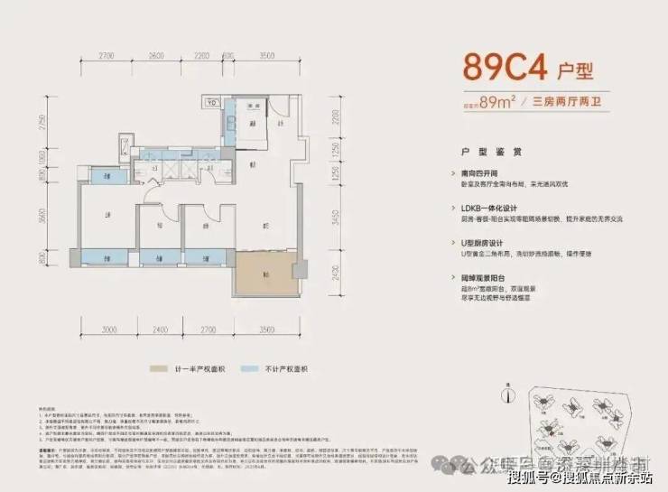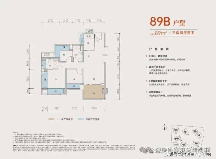 89㎡的3房2厅2卫,B户型,设计的是经典竖厅格局,进门入户玄关,客厅3.5米开间,LDKB一体化,动静分区,三开间朝南,S墙设计预留冰箱卡槽位,主卧+1个次卧270°飘窗,分别做到了主卧15.1㎡/次卧8.52㎡/次卧7.77㎡(包含墙体飘窗),U型厨房,卫生间干湿分离,得房率约:77.39%(不含赠送),西南朝向。赠送面积16.96㎡,加上赠送得房率96.84%。