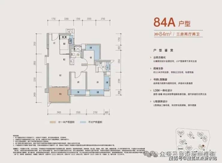 84㎡的3房2厅2卫,设计的是经典竖厅格局,进门入户玄关,客厅3.4米开间,LDKB一体化,S墙设计预留冰箱位,动静分区,分别做到了主卧13.5㎡/次卧8.75㎡/次卧8.6㎡(包含墙体飘窗),U型厨房,公卫三段式干湿分离,得房率约:77.2%(不含赠送),东北朝向。