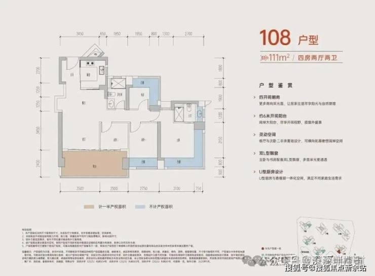 108-110㎡的4房2厅2卫,A户型,设计的是经典竖厅格局,进门入户玄关,客厅3.45米开间,LDKB一体化,S墙设计预留冰箱卡槽位,四开间朝南,动静分区,主卧+1个次卧270度大飘窗,客厅连接次卧出6米长大阳台,分别做到了主卧16.4㎡/次卧11.2㎡/次卧7.84㎡/次卧6.25㎡(包含墙体飘窗),U型厨房,卫生间干湿分离,得房率约:77.3-77.39%(不含赠送),西南朝向。赠送面积18.4㎡,加上赠送得房率94.04%。