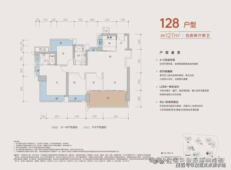 126-128㎡的4房2厅2卫,设计的是经典竖厅格局,进门入户玄关,客厅3.65米开间,LDKB一体化,S墙设计预留冰箱卡槽位,四开间朝南,动静分区,主卧+1个次卧270度大飘窗,客厅连接次卧出6.15米长大阳台,分别做到了主卧20.14㎡/次卧11.28㎡/次卧10.58㎡/次卧6.37㎡(包含墙体飘窗),U型厨房,卫生间干湿分离,得房率约:77.3-77.39%(不含赠送),东南朝向。赠送面积21.54㎡,加上赠送得房率94.45%。