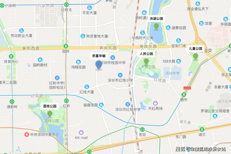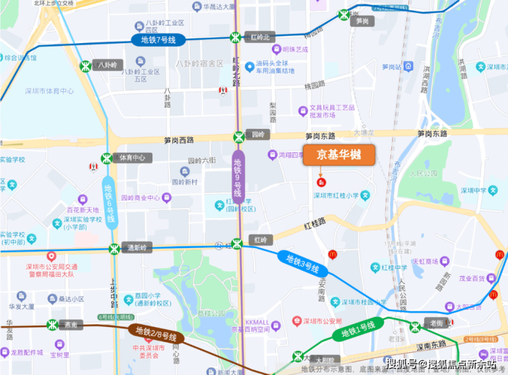 展开地图来看,京基蔡屋围板块有6条地铁线路环绕,而首发项目-京基华樾距离最近的9号线-园岭站直线距离约600米,与地铁3号线、9号线交汇的红岭站直线距离约700米,我愿把这称为“恰到好处的距离”:既能享受到地铁的便捷,又能不被轨道噪音所影响。[6]