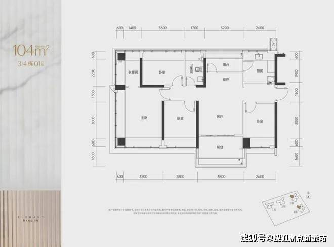 104㎡的4房2厅2卫,3/4栋01户型,设计的是竖厅南北通透格局,进门入户玄关,客厅3.8米开间,LDKB一体化设计,四开间朝南,4个卧室分别做到了主卧19.09㎡/次卧9.57㎡/次卧9.46㎡/次卧8.48㎡(包实测面积,去掉墙体),U型厨房,卫生间干湿分离,得房率约103.9%(包含赠送),阳台主朝西南向。