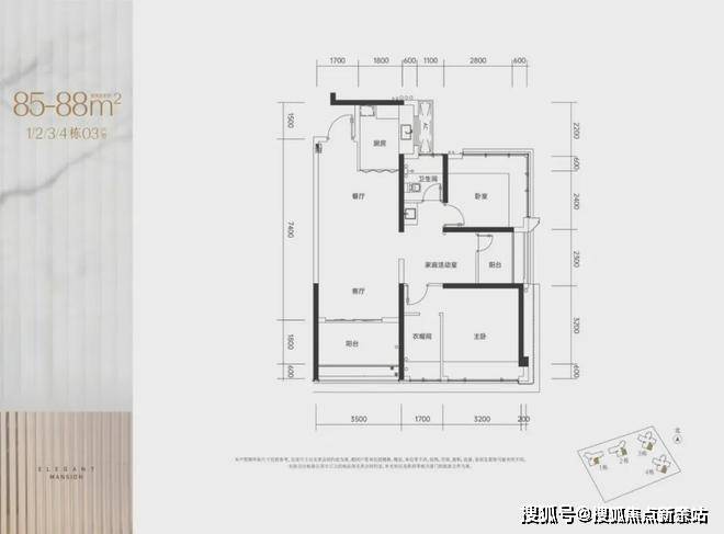 85-88㎡的3房2厅2卫,1/2/3/4栋02.03户型,设计的是竖厅格局,客厅3.5米开间,LDKB一体化设计,三开间朝南,3个卧室分别做到了主卧13.43㎡/次卧9.78㎡/次卧6.85㎡(实测面积,去掉墙体),L型厨房,公卫三段式分离,得房率约100-102.68%(包含赠送),东南或西南朝向。