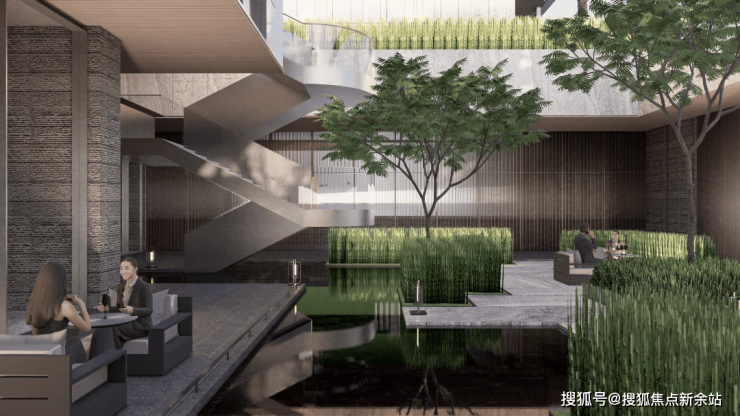 地下车库入户大堂前车马厅设计,借鉴了“港式归家”的理念,一般多在香港高端酒店采用,作为归家的第二道门,既温馨明亮,又超具昭示性。酒店式归家大堂与定制化下沉会所相结合,在负一层引入瀑布景观,整个景观体系更加立体。