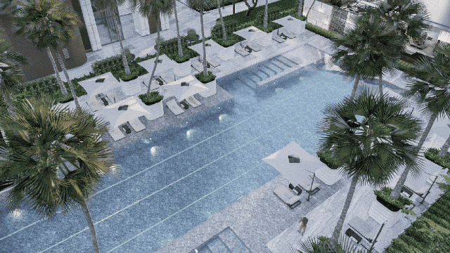 把浓厚的迈阿密酒店式隐奢滨海度假风融入生活日常,如此妙至毫巅的手笔来自新加坡JTL景观设计大师。