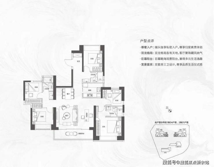 【124㎡的3+1房2厅2卫】1栋02/2栋04户型,电梯入户送独立公区,设计的是竖厅格局,动静分区,主卧套间设计,还有一个多功能间可以做书房,U型厨房,公卫三段式分离,得房率:72.07%(不含赠送)西南朝向;
