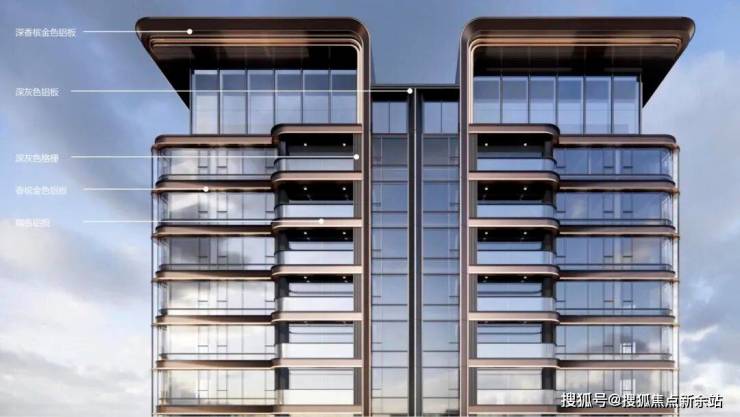 『卓越缦悦』建筑采用王座式塔冠,温润弧线设计,以及大面积通透LOW-E环幕玻璃幕墙,辅以香槟金、内敛灰、雅致咖的品质铝板线条勾勒,匠呈恒久典雅立面,契合改善奢宅定位。