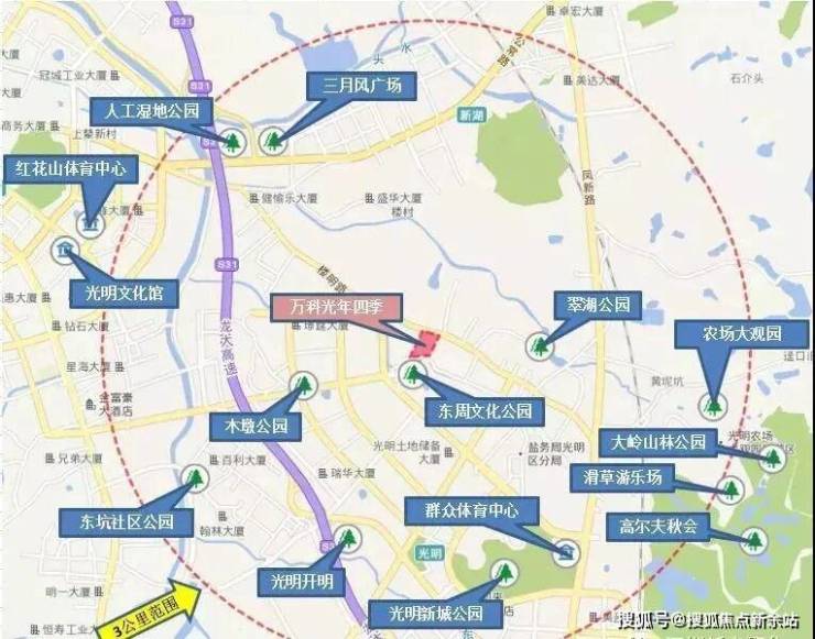 万科光年四季位于光明区光明中心区光明大街以南,东周公园以北,东侧为柑山路,西侧为明卓路,拆除用地面积约为3.7万㎡,计容总建面15.4万㎡,容积率6.9,实施主体为深圳市信城盈合房地产有限公司