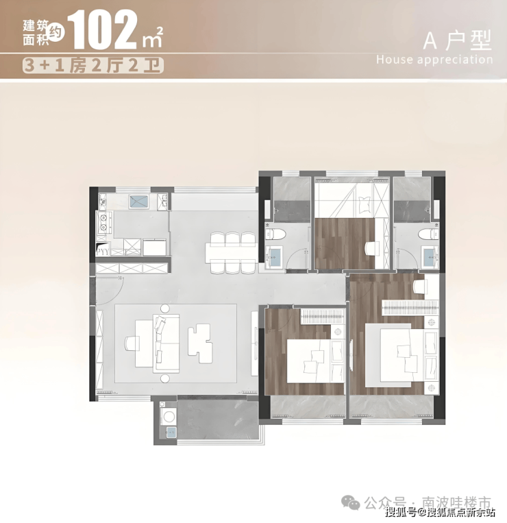 譬如建面约102㎡户型,有3+1房、4房两种交付选择,契合不同家庭居住需求