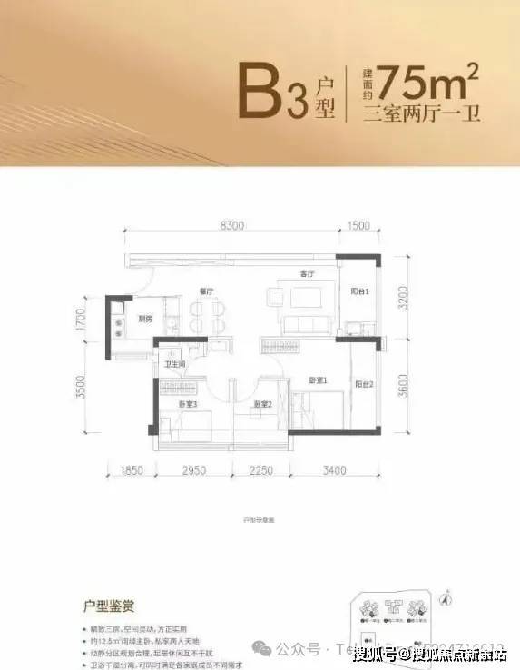 75㎡的3房2厅1卫,设计的是竖厅格局,客厅3.2米开间,进深8.3米,LDKB一体化设计,3个卧室分别做到了主卧13.06㎡/次卧6.8㎡/次卧5.22㎡(实测面积,去掉墙体飘窗),U型厨房,卫生间三段式分离,得房率约91%(包含赠送),东南朝向。
