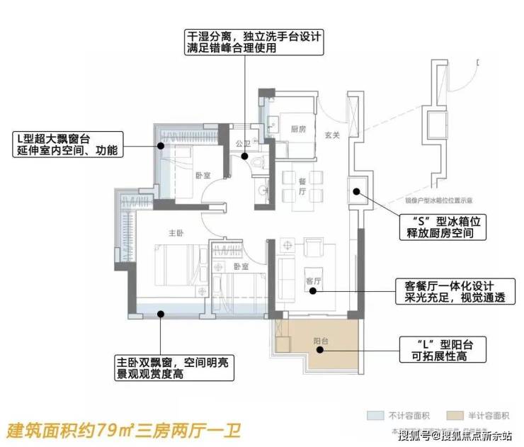 建筑面积约79㎡户型是该项目打造的主力作品,采用LDKB一体化设计、配备L型大阳台、7个飘窗;预留入户玄关位、S形冰箱位,均嵌入式设计,空间化零为整;还合理利用厨房的飘窗台,打造U形厨房;卫生间采用三分离设计,不仅实现干湿分离更卫生,使用效率也更高,满足三代同住的需求。