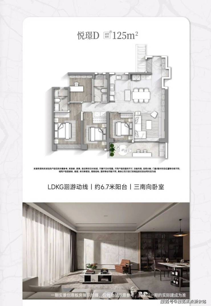 悦璟户型(123㎡)亮点:三南向卧室、6.6米双面宽阳台、LDKG一体化设计、主卧270°飘窗。