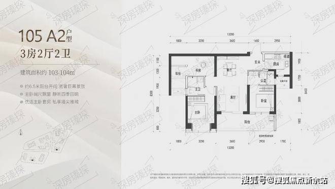 104㎡的3房2厅2卫,A1户型(2栋3单元03户型),设计的是竖厅类双龙抱珠格局,客厅3.6米开间,客餐厅一体化设计,3个卧室分别做到了主卧12.8㎡/次卧12㎡/次卧8.7㎡(包含墙体飘窗),客厅连接次卧出6.5米长的宽景大阳台,U型厨房,公卫三段式分离,得房率约90%(包含赠送),东南朝向。