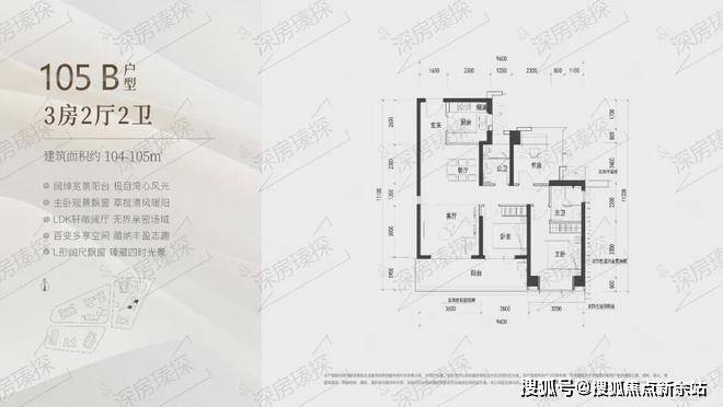 105㎡的3房2厅2卫,B户型(2栋3单元02/06户型),设计的是经典竖厅格局,客厅3.6米开间,LDKB一体化设计,三开间朝南,动静分区,3个卧室分别做到了主卧13.12㎡/次卧9.9㎡/次卧8.4㎡(包含墙体飘窗),客厅连接次卧出6.4米长的宽景大阳台,U型厨房,卫生间干湿分离,得房率约90%(包含赠送),正南或东南朝向。