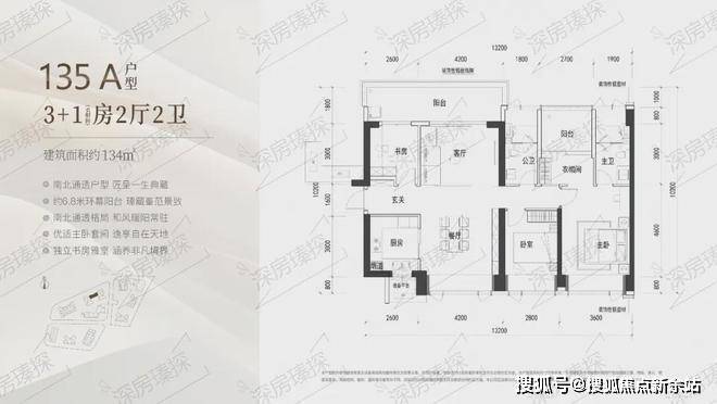 134㎡的4房2厅2卫,A户型(1栋1/2单元05户型),设计的是竖厅南北通透格局,进门入户玄关,客厅4.2米开间,LDKB一体化设计,四开间朝南,4个卧室分别做到了主卧19.44㎡/次卧10.64㎡/次卧10.26㎡/次卧7.8㎡(包含墙体飘窗),客厅连接次卧出6.8米长的观景大阳台看深大校区,U型厨房,卫生间干湿分离,得房率约90%(包含赠送),西北朝向。